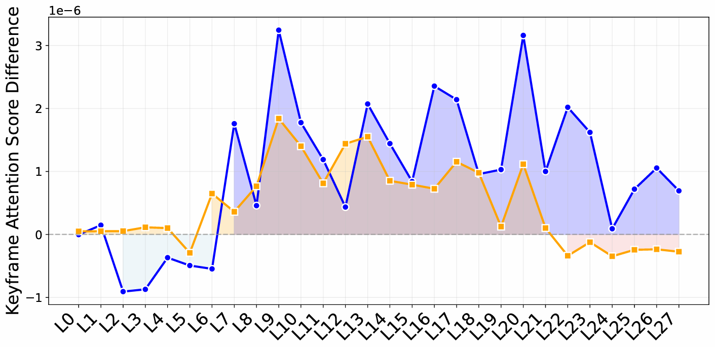 The blue represents the attention difference for Video keyframes, while the yellow represents Audio keyframes.