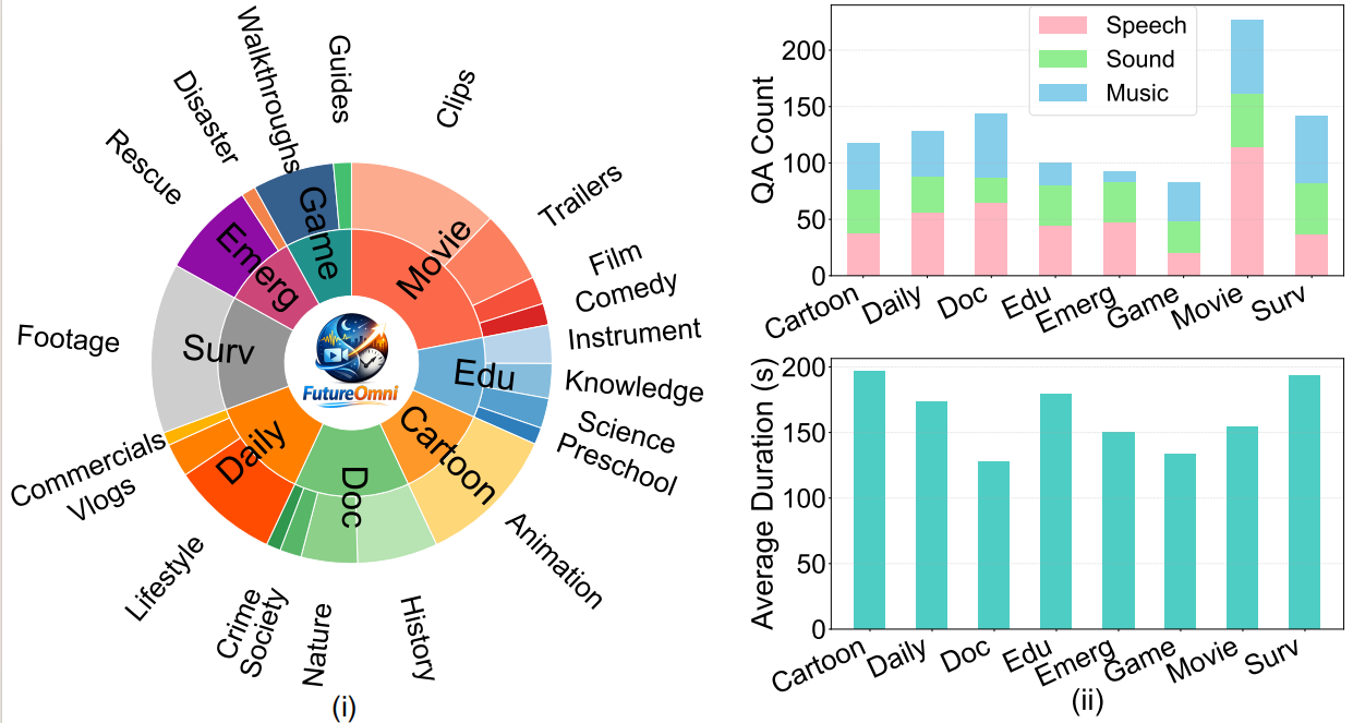 (i) Video category hierarchy. (ii) Audio QA Count and Video duration distribution.